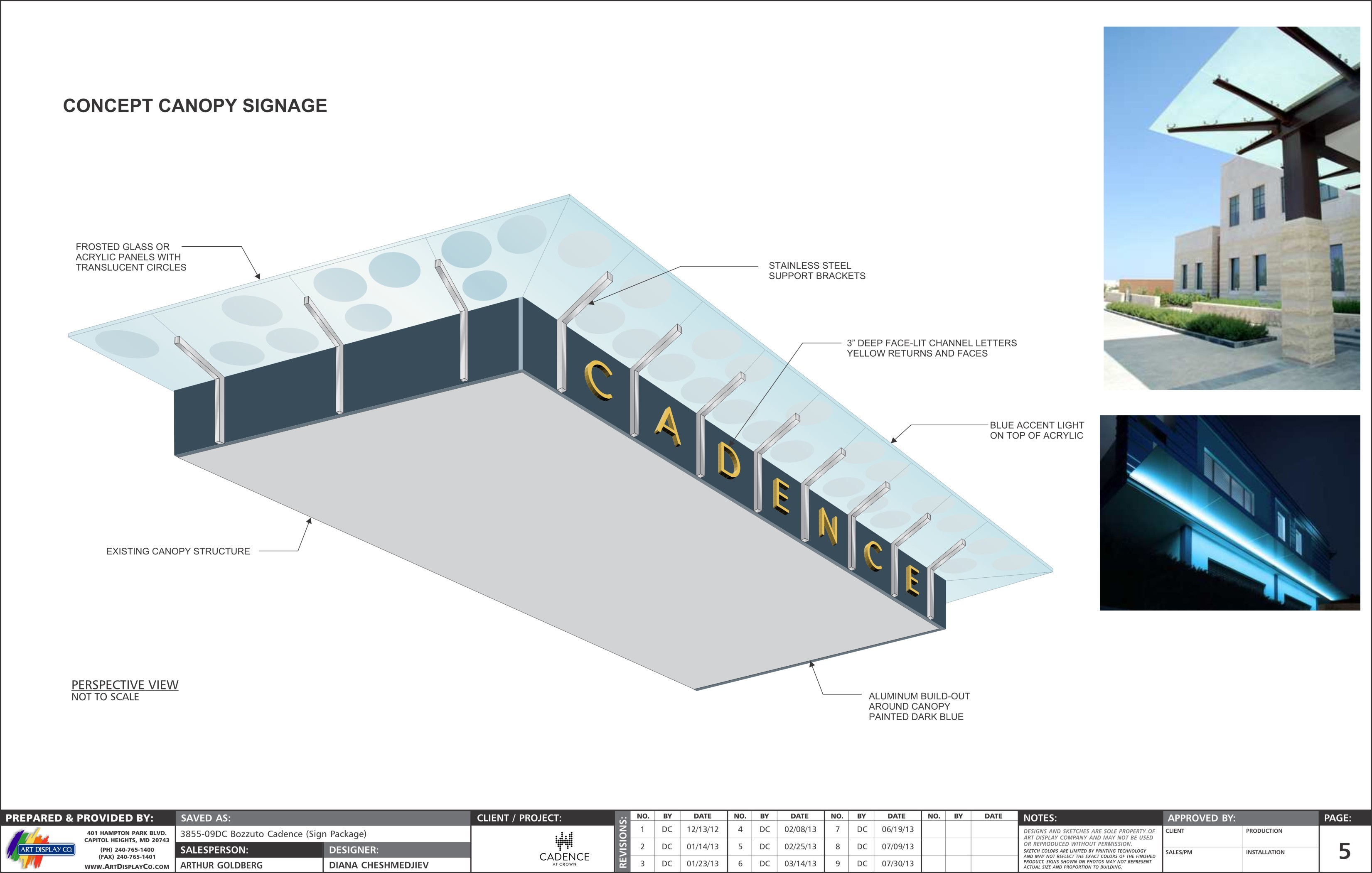 I wanted to emulate the change in dot color from the logo icon, and play with transparency. I designed a canopy surround with translucent panels, circles that echo the logo, and illuminated letters on the front. The blue architectural light behind the panels would illuminate the circles at night and add more interest. Coming up with a concept that the client would love turned out to be the easy part! In order to build it, we had to ensure the weight of the new surround (and any snow) would be safely supported by the existing canopy structure, and take into account how water would drain into the existing built-in system. I consulted with engineering for the best way to build and specify the surround, and then with estimating to find the most suitable products for lighting, tubing, and the translucent overhang.